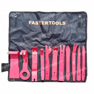 Набір знімачів автомобільної обшивки 11 шт пластик, не займають багато місця завдяки ергономічній упаковці в чохлі з липучкою, є можливість повісити набір на стіну або зберігати в складеному стані, кожен інструмент має кишеньку.